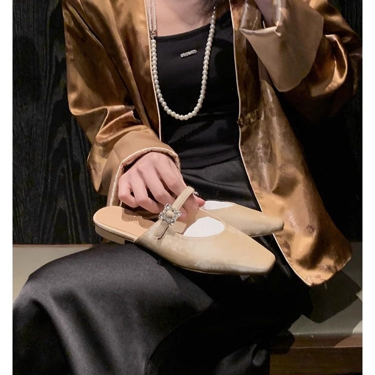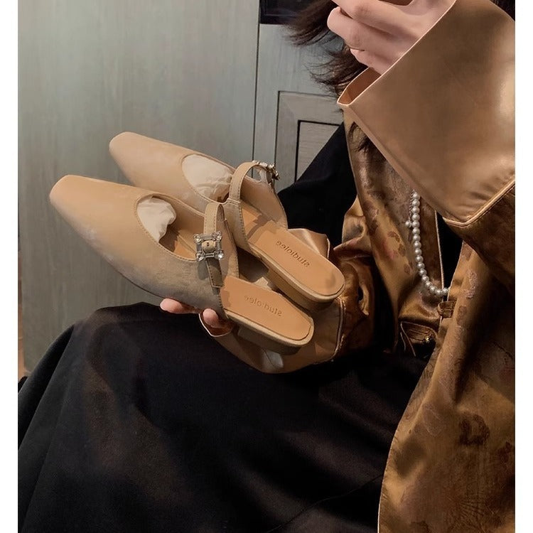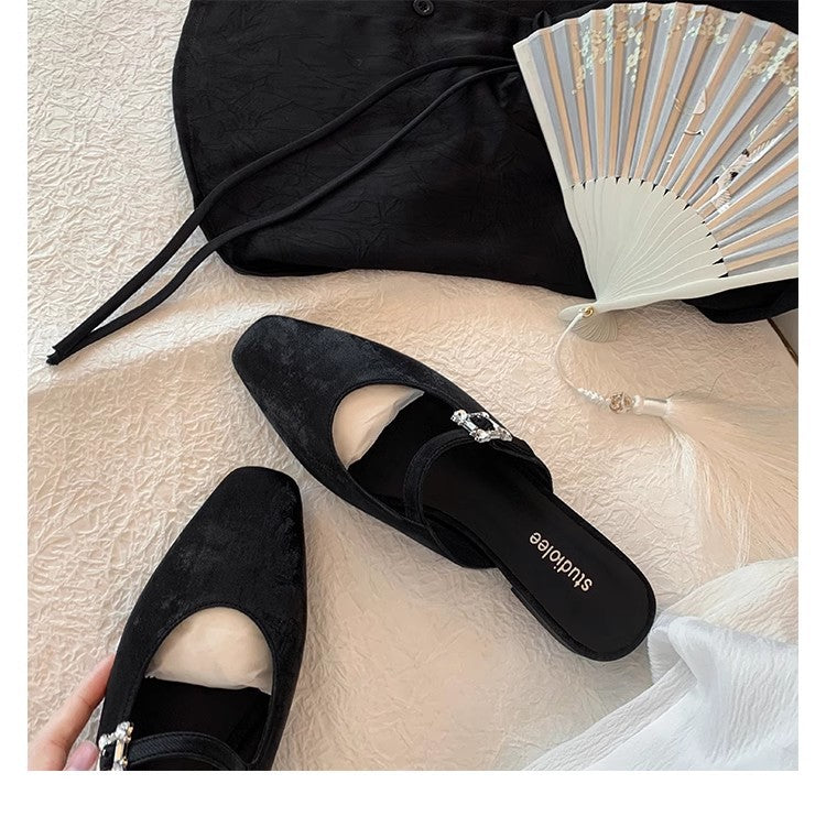 Women's French Square Toe Drill Buckle Low Muller Closed Half Sandals