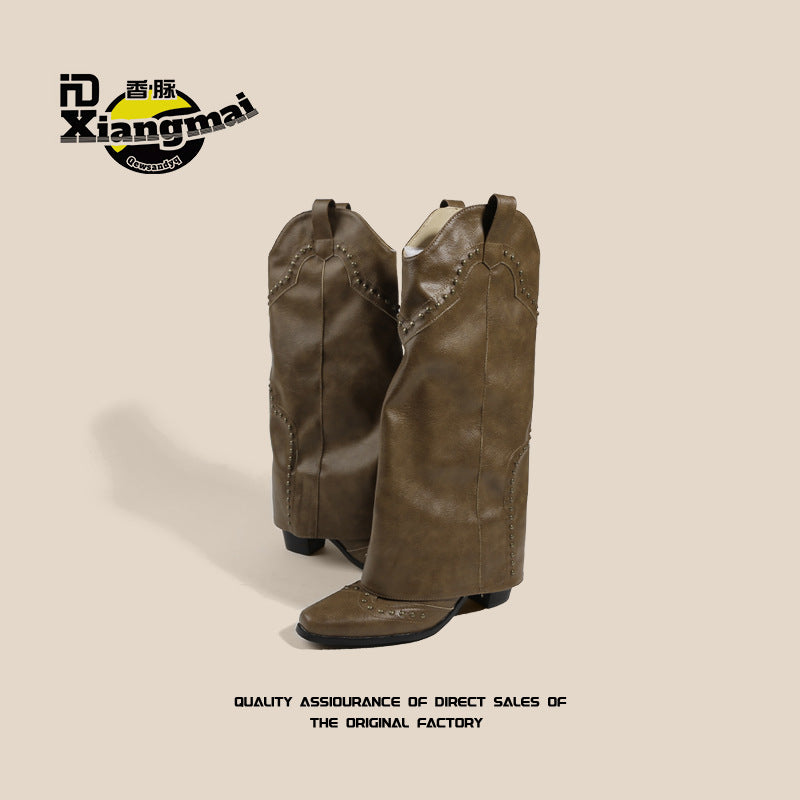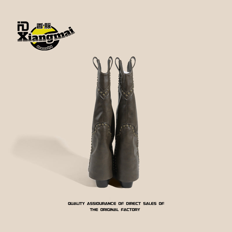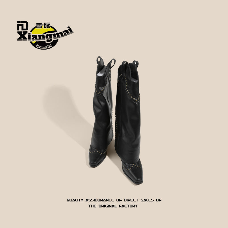Women's Million Single Retro Pointed Rivets Pantyhose Boots