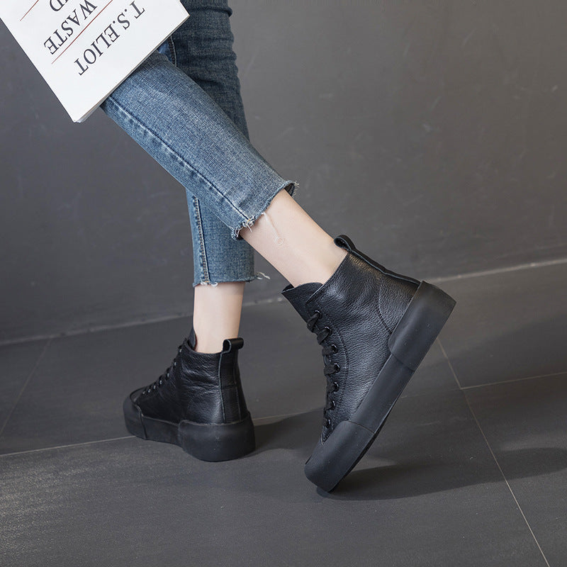 Women's Spring Cowhide Soft Bottom White Flat Sneakers
